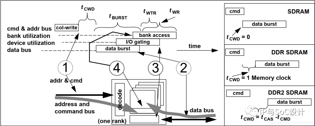 了解了DDR的基本组成后,我们来看看DDR如何来完成一次的读写过程。如下图所示,DRAM 的相关操作在内部大概可以分为以下的四个阶段: