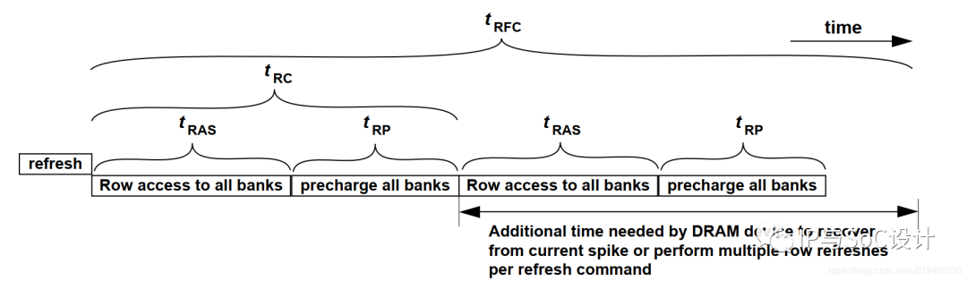 tRFC 包含两个部分的时间,一是完成刷新操作所需要的时间,由于 DRAM Refresh 是同时对所有 Bank 进行的,刷新操作会比单个 Row 的 Active + Precharge 操作需要更长的时间;tRFC 的另一部分时间则是为了降低平均功耗而引入的延时,DRAM Refresh 操作所消耗的电流会比单个 Row 的 Active + Precharge 操作要大的多,tRFC 中引入额外的时延可以限制 Refresh 操作的频率。