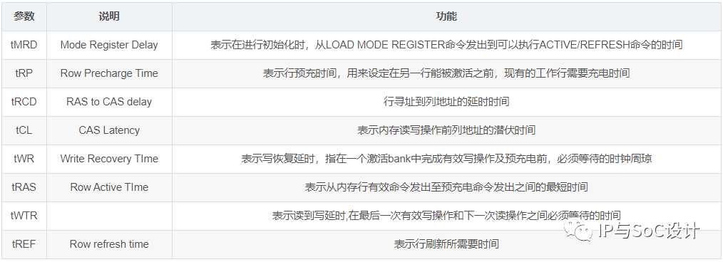 在上述的四个阶段中,每个阶段都会有一定的耗时,例如数据从 DRAM Cells 搬运到 Read Latchs 的操作需要一定的时间,因此在一个具体的操作需要按照一定时序进行。同时,由于内部的一些部件可能会被多个操作使用,例如读数据和写数据都需要用到部分 IO 电路,因此多个不同的操作通常不能同时进行,也需要遵守一定的时序。此外,某些操作会消耗很大的电流,为了满足 SDRAM 设计上的功耗指标,可能会限制某一些操作的执行频率。