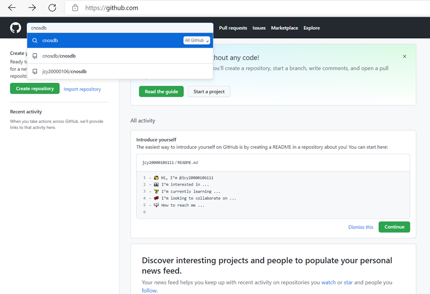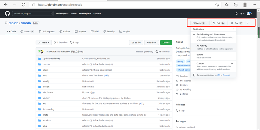 一、在登陆后的GitHub首页左上角,输入搜索cnosdb二、选中第一个搜索结果,即进入CnosDB的代码仓库三、点亮CnosDB代码仓库右上角的Watch、Fork和Star,完成“一键三连”Watch:关注这个项目的所有动态(当选择All Activity时)。以后只要这个项目发生变动,如被别人提交了pull request、发起issue等,你都会在自己的个人通知中心收到通知消息。如果你设置了个人邮箱,那么你的邮箱也会收到相应的邮件。Fork:相当于你自己拷贝一份原项目的代码,当然这个拷贝仅针对当时的项目文件。当你想帮助原项目作者去完善这个项目,或者单纯的想在原项目基础上维护一个属于自己项目,那么你可以 fork 一份项目下来,然后自己对这个项目进行修改完善。当你觉得项目没问题了,你就可以尝试发起 pull request 给原项目作者了。Star:可以理解成朋友圈的点赞,表示对这个项目的支持。