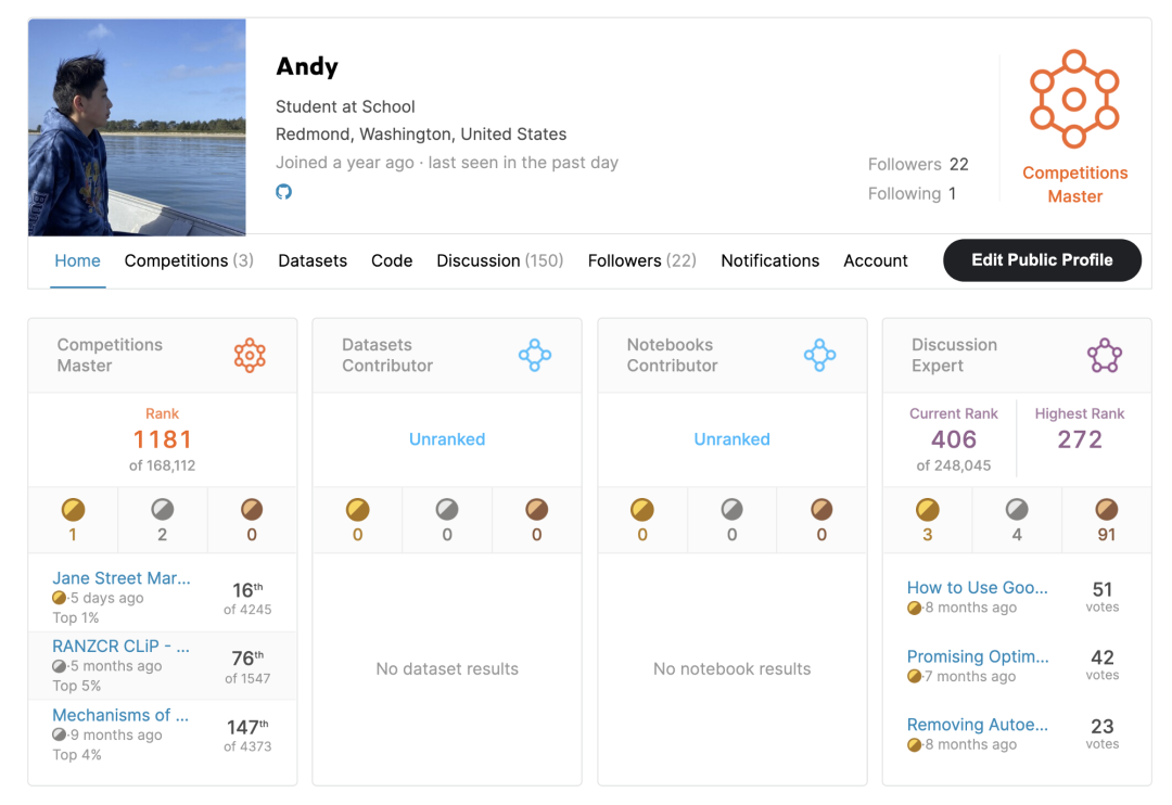 我是 Andy Wang,一名高中新生,对数学、人工智能和计算机科学有着浓厚的兴趣。我在Kaggle上学习和提高我的技能,获得了2枚银牌和1枚金牌。