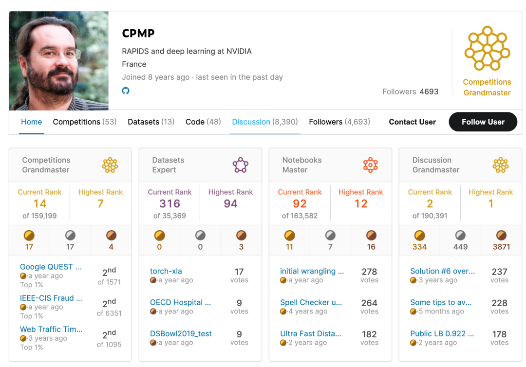 近年来Puget开始在Kaggle上时间机器学习,并参加了多场比赛。Puget是competition and discussion grandmaster, Kaggle排名最高前10。Puget现在NVIDIA工作。