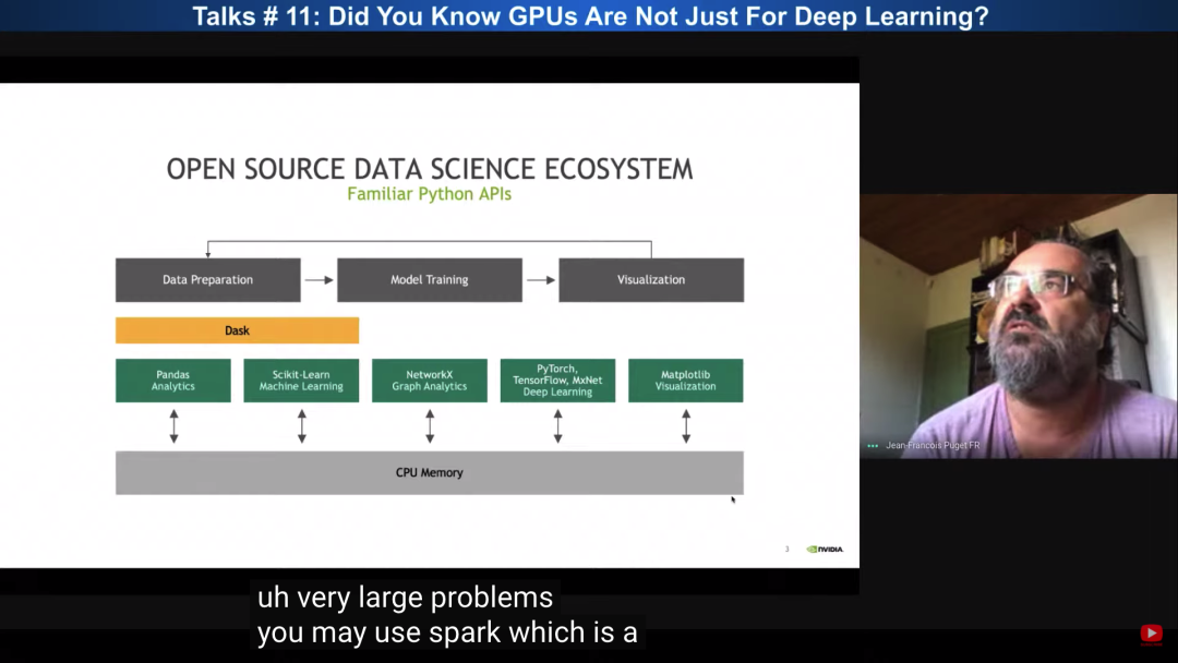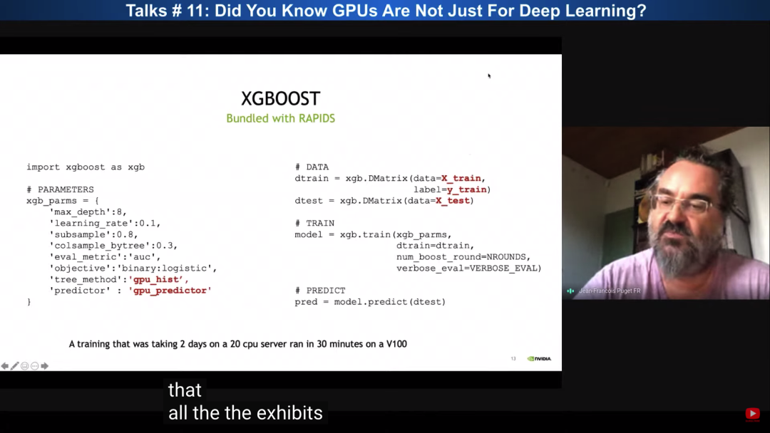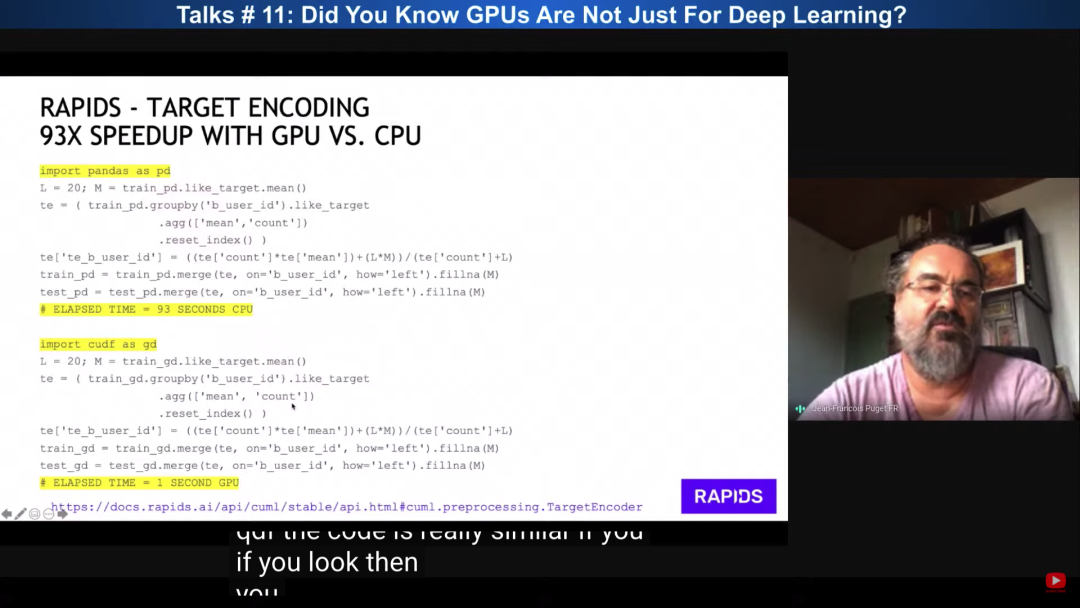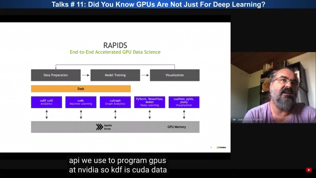 然后Puget介绍了GPU的性能,多核计算,通讯带宽上限高。之后Puget介绍了RAPIDS