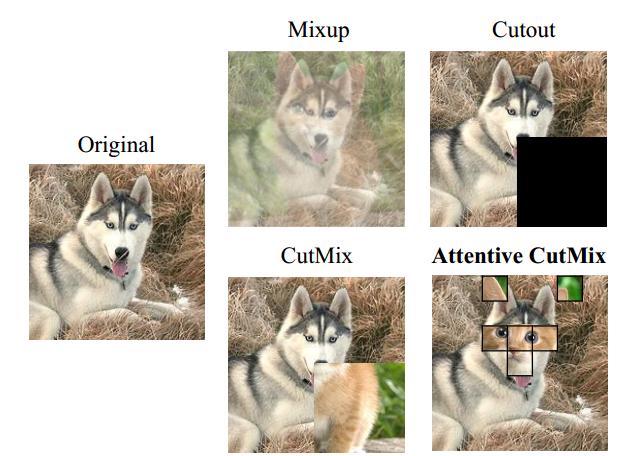 Mixup是直接进行两张图像素的差值,标签也进行差值;CutMix是使用Cutout的区域进行像素填充;Attentive CutMix使用模型预测的激活区域进行像素填充。Attentive CutMix是20年比较新的论文,只在CIFAR数据集上进行了验证,时间复杂度较高。