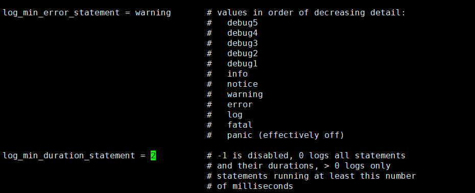 log_min_duration_statement 是对应慢查询的日志,当设置的值大于0 后,则超过对应设置数字秒数的SQL 语句将被记录。