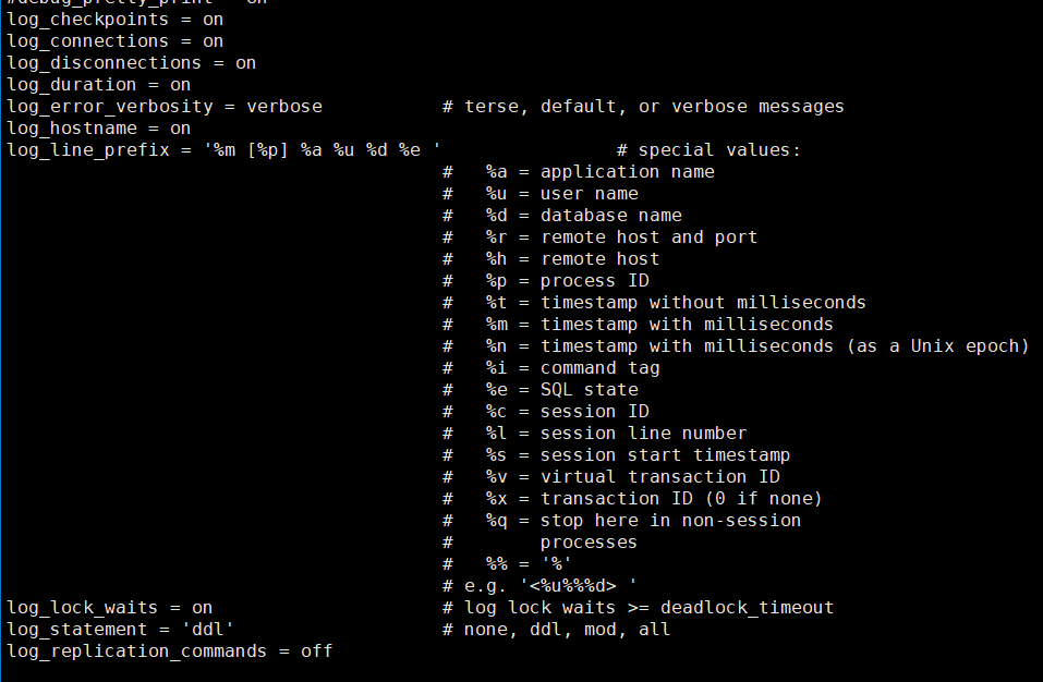 6 log_line_prefix 相当于对日志的打印的格式和信息的设置,有些监控系统对此是有要求的,请按照你安装的监控系统的要求配置此栏