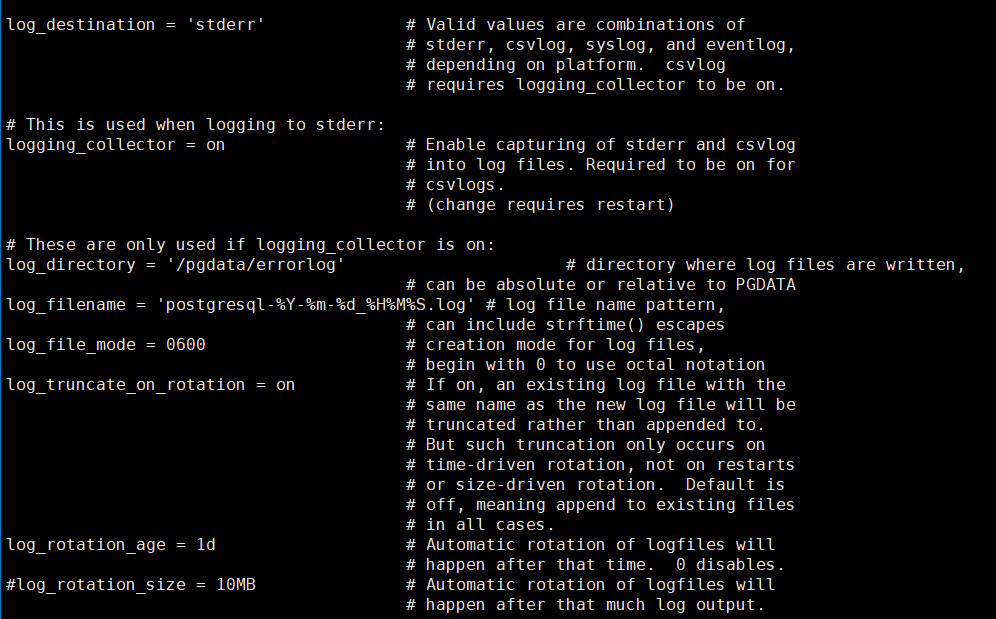 另外日志的定期清理方面PG比其他的开源数据库要做到好多了,因为不少人都的自己写日志的rotate 和 clean up的脚本,PG 这里不需要,你只需要在 log_rotation_age中设置你要保留几天的日志,同时 log_truncate_on_rotation 设置为on 就可以了,这点是非常人性化的。或者你也可以根据日志的大小进行设置如何抛弃他。