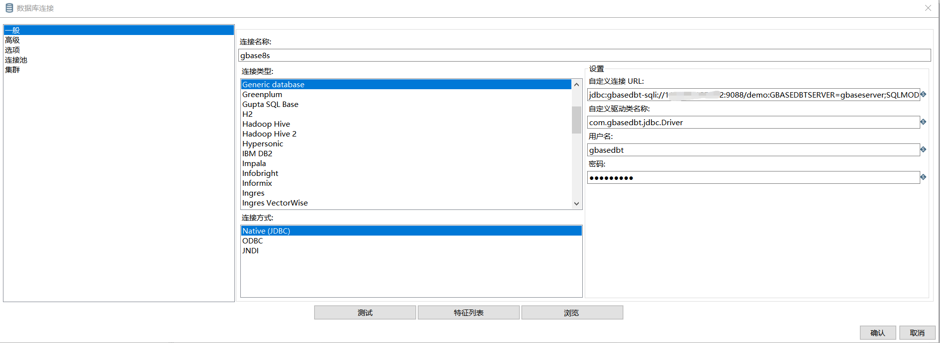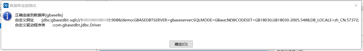 配置JDBC URL,GBase 8s的URL格式为:jdbc:gbasedbt-sqli:[//{host}][:{port}]/{database}:GBASEDBTSERVER={server}[;DB_LOCALE=zh_CN.utf8;CLIENT_LOCALE=zh_CN.utf8]