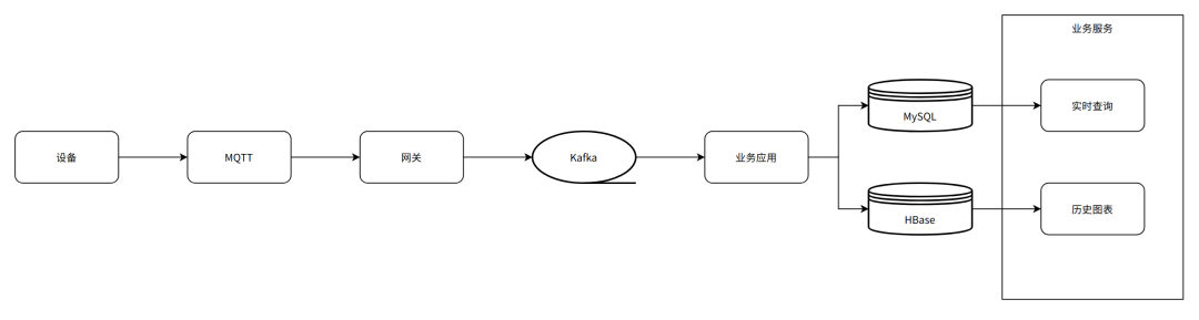 在业务诞生之初,我们用作数据存储的选型是MySQL + HBase,MySQL存储设备最新实时数据,HBase存储设备原始数据,大体架构如下: