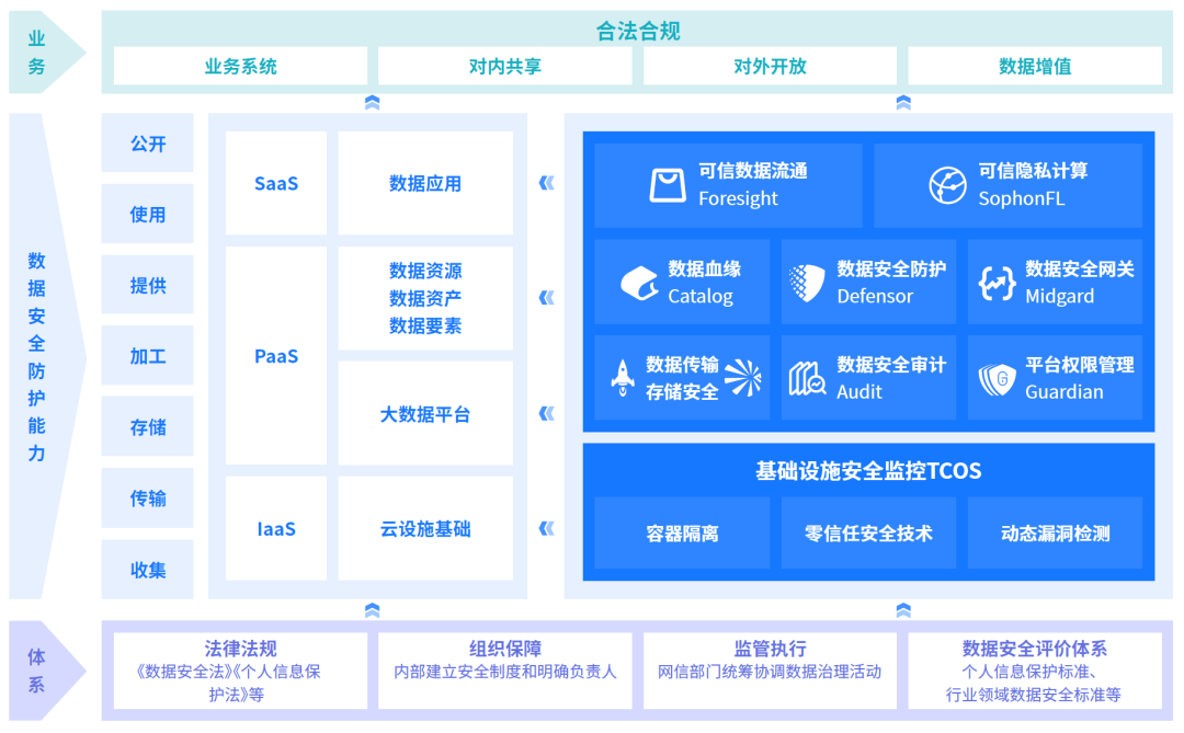 安全大数据平台解决方案是星环科技通过自有技术创新,推出的由IaaS、PaaS和SaaS层数据安全加固的系列产品所组成的解决方案,提供了从云基础设施、数据平台、数据资源、数据应用的南北向数据安全能力。同时,该解决方案还覆盖数据生命周期的各个阶段,涉及数据的收集、存储、使用、加工以及开放流通。这种矩阵式的数据安全能力体系,可全方位保障客户的数据安全,支撑业务合法合规的开展。