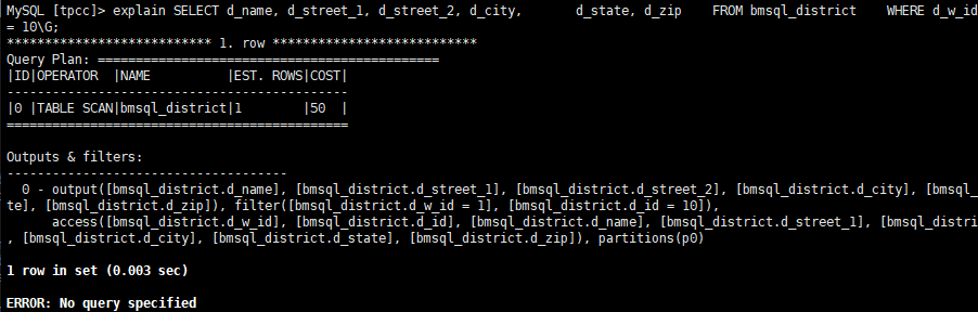 MySQL [tpcc]> explain SELECT d_name, d_street_1, d_street_2, d_city, d_state, d_zip FROM bmsql_district WHERE d_w_id = 1 AND d_id = 10\G;