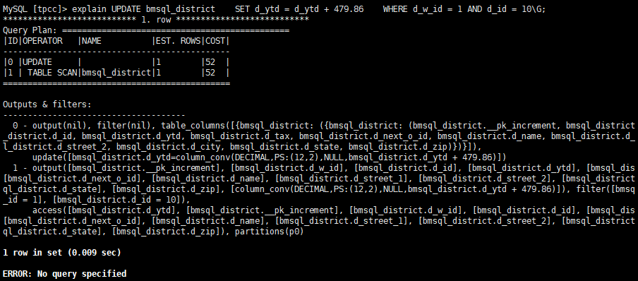 MySQL [tpcc]> explain UPDATE bmsql_district SET d_ytd = d_ytd + 479.86 WHERE d_w_id = 1 AND d_id = 10\G;