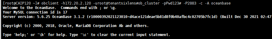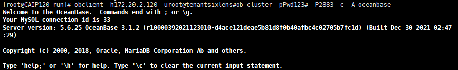 [root@CAIP120 run]# obclient -h172.20.2.120 -uroot@tenantsixlens#ob_cluster -pPwd123# -P2883 -c -A oceanbase