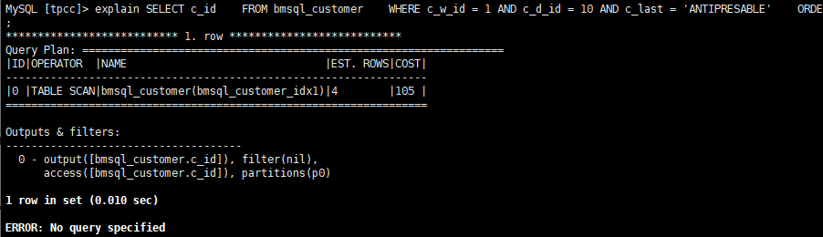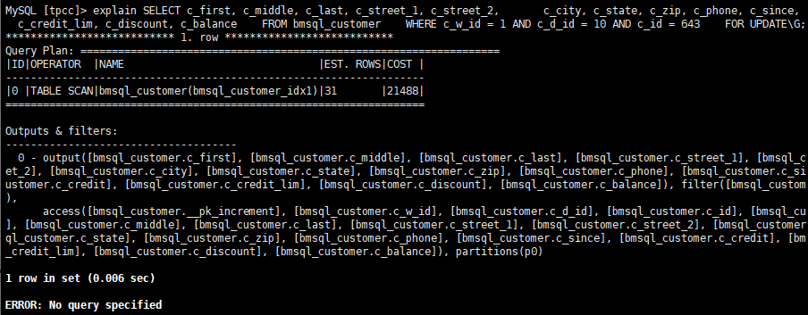 MySQL [tpcc]> explain SELECT c_first, c_middle, c_last, c_street_1, c_street_2, c_city, c_state, c_zip, c_phone, c_since, c_credit, c_credit_lim, c_discount, c_balance FROM bmsql_customer WHERE c_w_id = 1 AND c_d_id = 10 AND c_id = 643 FOR UPDATE\G;