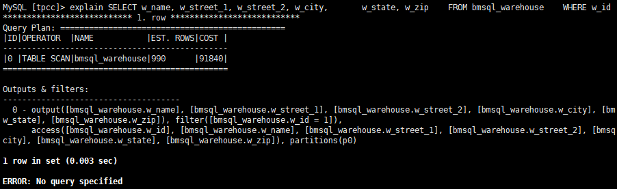MySQL [tpcc]> explain SELECT w_name, w_street_1, w_street_2, w_city, w_state, w_zip FROM bmsql_warehouse WHERE w_id = 1 \G;