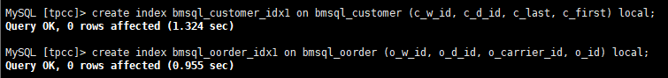 MySQL [tpcc]> create index bmsql_customer_idx1 on bmsql_customer (c_w_id, c_d_id, c_last, c_first) local;