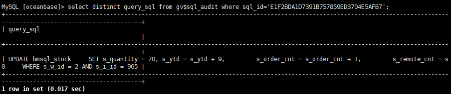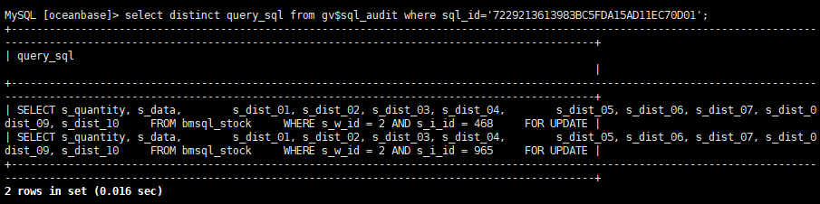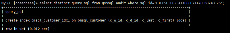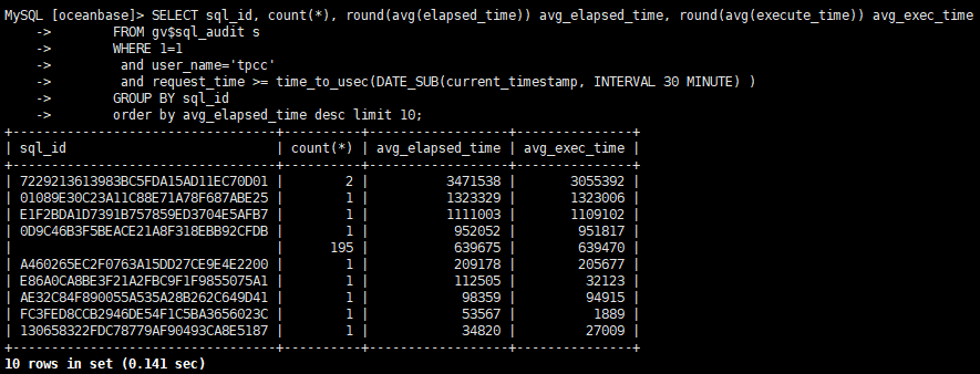 MySQL [oceanbase]> SELECT sql_id, count(*), round(avg(elapsed_time)) avg_elapsed_time, round(avg(execute_time)) avg_exec_time -> FROM gv$sql_audit s