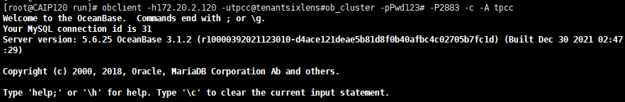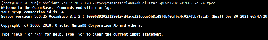 [root@CAIP120 run]# obclient -h172.20.2.120 -utpcc@tenantsixlens#ob_cluster -pPwd123# -P2883 -c -A tpcc