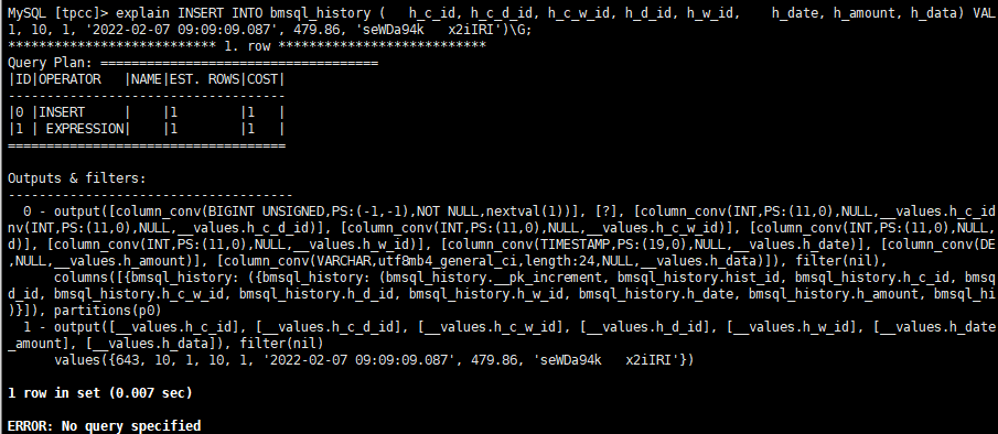 MySQL [tpcc]> explain INSERT INTO bmsql_history ( h_c_id, h_c_d_id, h_c_w_id, h_d_id, h_w_id, h_date, h_amount, h_data) VALUES (643, 10, 1, 10, 1, '2022-02-07 09:09:09.087', 479.86, 'seWDa94k x2iIRI')\G;