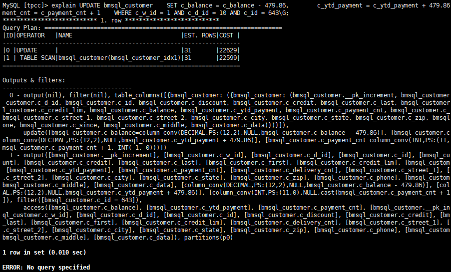 MySQL [tpcc]> explain UPDATE bmsql_customer SET c_balance = c_balance - 479.86, c_ytd_payment = c_ytd_payment + 479.86, c_payment_cnt = c_payment_cnt + 1 WHERE c_w_id = 1 AND c_d_id = 10 AND c_id = 643\G;