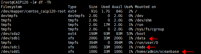 | 事务日志盘 /redo | dev/vdc 100G | GPT分区、文件系统:xfs |