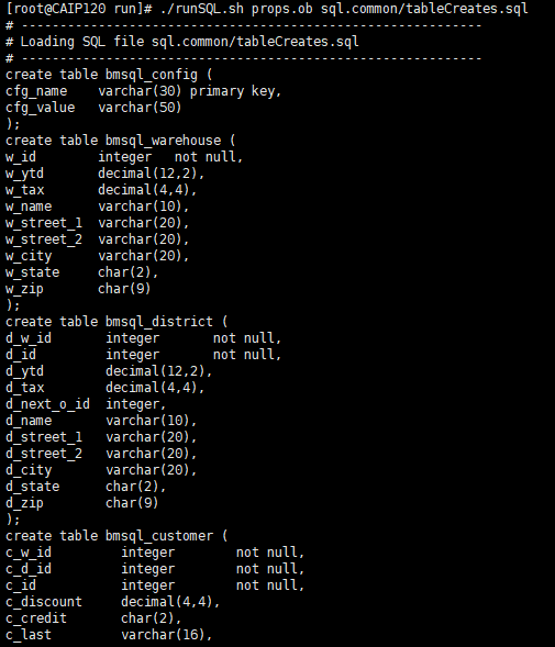 [root@CAIP120 run]# ./runSQL.sh props.ob sql.common/tableCreates.sql