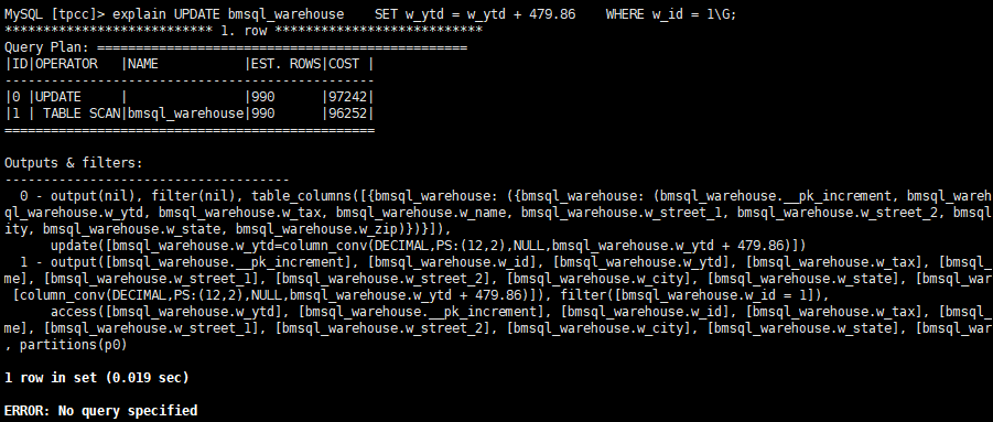 MySQL [tpcc]> explain UPDATE bmsql_warehouse SET w_ytd = w_ytd + 479.86 WHERE w_id = 1\G;
