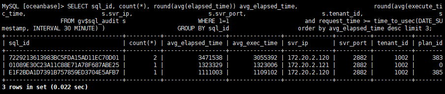 MySQL [oceanbase]> SELECT sql_id, count(*), round(avg(elapsed_time)) avg_elapsed_time,
