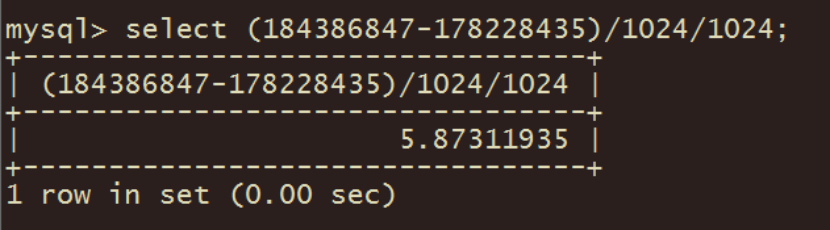 select round((1167787001- 1159609513)*60/1024/1024) “1 hour log(MB)”;