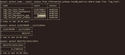 select name , count, status from information_schema.innodb_metrics where name like ‘log_lsn%’;