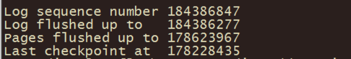 这里的lsn是184386847,最近一次检查点的lsn是178228435,计算出当前日志文件的使用量是这两个值之差:大约5.8M