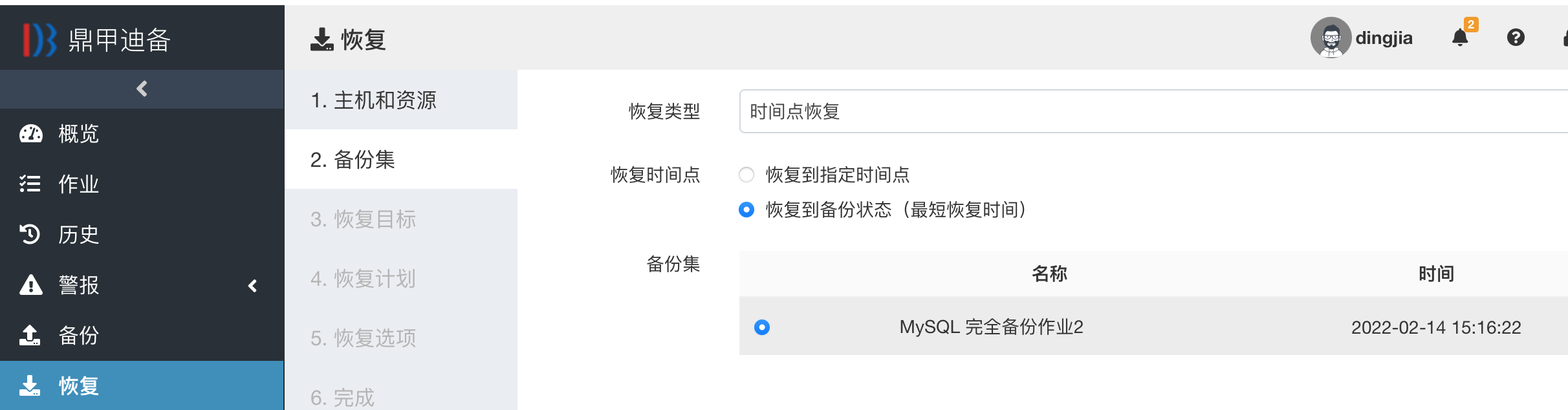 在选择恢复类型时注意不要选择“恢复到指定时间点”,而要选择“恢复到备份状态(最短恢复时间)”,如下图: