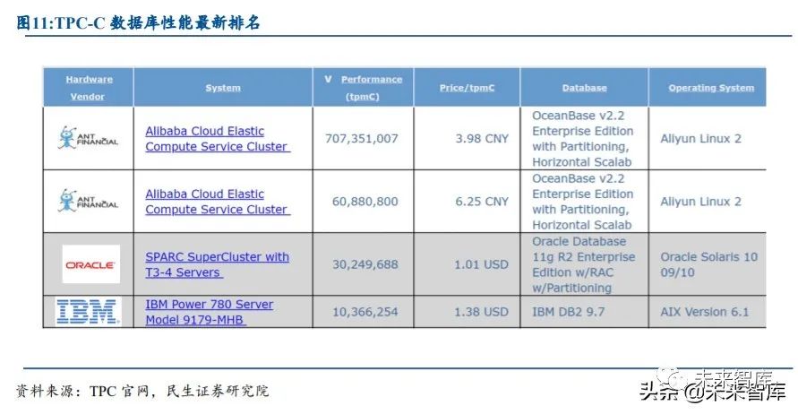 TPC 是国际上最流行和广泛接受的数据库性能标准测试。TPC(事务处理性能委员会)是 由十几家会员公司创建的非盈利组织,总部设在美国。TPC 的成员主要是计算机软硬件厂家, 主要功能是制定商务应用基准程序的标准规范、性能和价格度量,并管理测试结果的发布。针 对不同类型数据库之间的区别,TPC 颁布了对于数据库在线事务处理(OLTP)能力测试的基准 程序 TPC-C 和在线分析处理(OLAP)能力测试的基准程序 TPC-DS。TPC-C 测试中的 tpmC 值 (TPC-C 测试过程的吞吐量,按有效 TPC-C 配置期间每分钟处理的平均交易次数测量),在国 内外被广泛用于衡量数据库系统的事务处理能力。根据 TPC-C 最新排名,蚂蚁金服自研的 OceanBase 数据库 tpmC 值达到 707,351,007,成功超越之前的记录,击败 Oracle 和 IBM 的数 据库,登顶榜首。