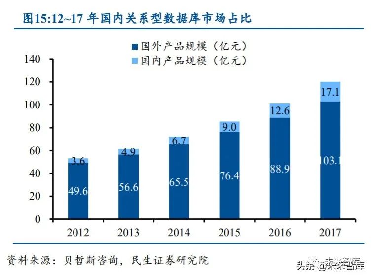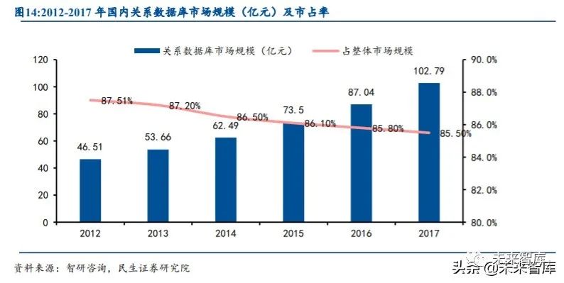 据库市场当前情况,传统关系型数据库仍占主导,国内市场规模从 2012 年的 46.51 亿元增 长到 2017 年的 102.8 亿元,复合增速为 17%,略高于行业增速,市占率超 85%。
