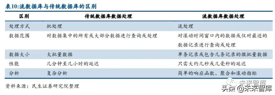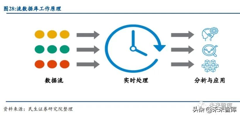 流数据库成为新潮流。在内存数据库中,主打事务处理和实时分析结合的流数据库成为新 潮流。流数据库是指能实时收集、处理、存储流数据(一组顺序、大量、快速、连续到达的数 据序列)的数据库。相比传统数据库分批处理数据,流数据库在对数据完成实时分类、分析、 存储等环节,应对海量数据涌入时,仍能保持实时响应和低延迟。流数据库通常采用内存作为 数据存储方式,并采用分布式架构,需要高速处理的数据可异步快速加载到处理集群内存中;处理集群可轻易地扩展到数百个物理节点,提升处理速度。流数据库适用于快速响应、实时分 析、实时监控等场景。对于企业,依靠流数据库强大的实时数据反馈与商业智能结合,对终端 用户数据监控并迅速做出决策,有效提升运营效率并减少决策时间,更好地在商业竞争中取得 优势。