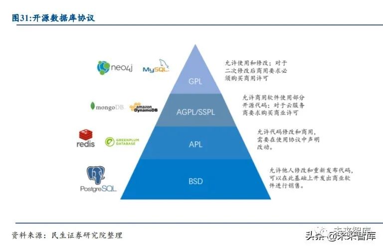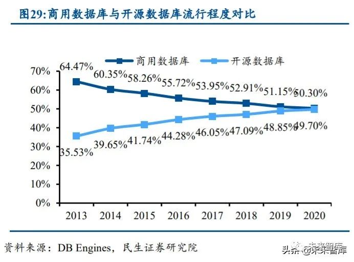 开源数据库成为更多企业的选择。开源数据库是指源码完全开放,可供大众下载和修改的 数据库。常见的开源数据库有 MySQL、PostgreSQL、MongoDB 等。面对价格低廉、性能相等、 生态不断完善的开源数据库,昂贵的商业数据库逐渐失去市场优势。根据数据库权威排名 DB Engines 数据显示,截至 2019 年开源数据库和商业数据库已平分秋色,考虑到大部分云数据库 采用开源架构,随着开源数据库生态不断完善、功能日益丰富,未来开源数据库的市场份额将 进一步提升。商业数据库虽然份额持续下降,但这并不意味着商业数据库会退出市场。对于一 些注重数据安全性的企业,如银行、跨国公司,商业数据库依旧是一个让人放心的选择。此外, 一些长期使用商业数据库的大型企业,如果从商业数据库转变为开源数据库需要复杂的数据 迁移,这会影响企业的日常业务。此外,开源数据库如 MySQL、Neo4j 等由于协议的开放性, 限制了其他企业商用能力;虽然存在社区贡献者和个人开发者,但社区整体生态和服务支持比 商用数据库仍相差甚远。综合来看,商业与开源数据库各有优劣:开源数据库在互联网行业和 小微企业很有市场;传统行业和大型企业依旧高度依赖商业数据库。