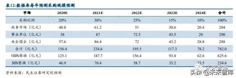 我们预计数据库的国产采购于 2020 年开始,到 2024 年完成全部采购,每年采购项目分别 占整体市场规模的 20%、30%、25%、15%、10%,算得 2020-2024 市场采购规模分别为 156 亿、235 亿、196 亿、117 亿和 78 亿元。按 100%替换计算,则合计未来 5 年,政府、事业单位 和国企采购将为国产数据库市场带来增量 626 亿(已有近乎 20%国产不替换),50%替换则新增 空间 235 亿。