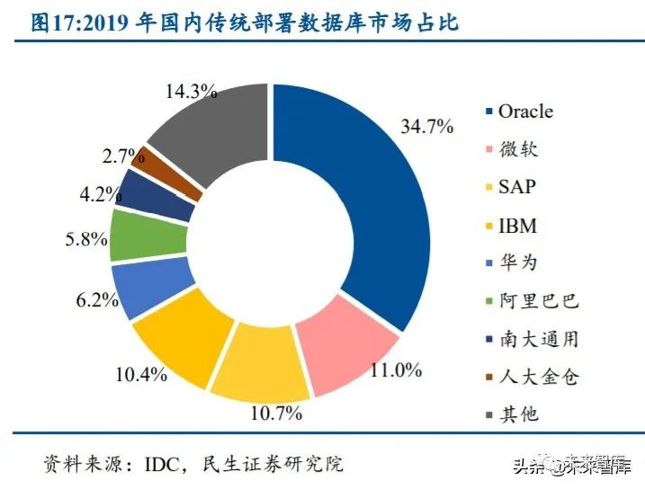 国内数据库市场面临新入跨界巨头的竞争,南大通用、人大金仓和武汉达梦等传统数据 库公司份额有所下降。华为、阿里 2019 年起将自研数据库推入市场并进行大力的商业推广, 加剧国内数据库市场竞争。根据 IDC 的数据,2019 年国内传统部署的关系型数据库市场中, 华为数据库以 6.2%的市场份额位列第五,排在 Oracle、Microsoft、IBM、SAP 之后;阿里巴 巴以 5.8%的市场份额位列第六;而传统数据库厂商南大通用和人大金仓分别以 4.2%和 2.7%的 市场份额排在第七、八位