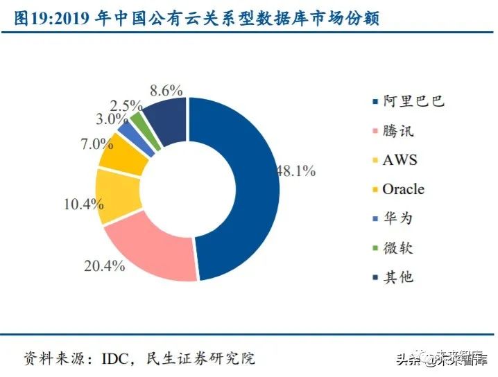当前云部署已成为国内关系型数据库新方式,国内数据库云化率持续上升。根据 IDC 数 据,2019 年中国关系型数据库传统部署模式的市场规模为 7.9 亿美元,公有云模式市场规模为 5.5 亿美元,同比增速 30%。其中,2019 年阿里巴巴在公有云关系型数据库市场中以 48.1%的 市场份额排名第一;腾讯以 20.4%的市场份额排名第二,AWS 以 10.4%的市场份额排名第三;随着企业数智化转型和数据上云的持续,未来 3 年国内数据库采用云部署的市场增速将超过 关系型整体市场 23.2%的行业增速。