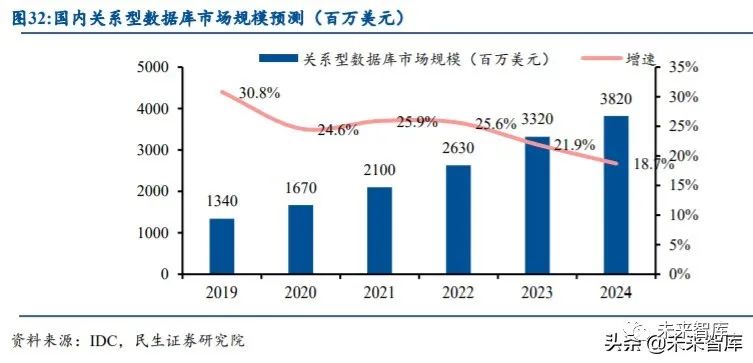 国内数据库市场潜力巨大。自 2012 年以来,国内数据库市场迎来蓬勃发展期,进入百花 齐放时期。传统数据库厂商和云数据库服务商都在加速产品迭代和推出新的产品。同时,新兴 数据库厂商不断涌现,以及其他领域厂商向数据库跨界情况的增多,使中国数据库市场更加繁 荣和活跃。根据 IDC 中国的数据显示,2019 年中国关系型数据库软件市场规模为 13.4 亿美元。其中,传统数据库市场规模为 7.9 亿美元,公有云数据库市场规模为 5.5 亿美元,整体市场同 比增长 30.8%。IDC 预测,到 2024 年,中国关系型数据库软件市场规模将达到 38.2 亿美元, 公有云关系型数据库软件市场规模将达到 25.1 亿美元。