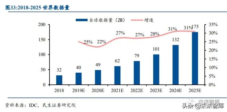 信息量爆发式增长,数据库需求提升。IDC 在报告指出,全球数据量总和将从 2018 年的 32ZB 增至 2025 年的 175ZB,信息数据呈爆发增长态势。由于中国上网人数的增加以及视频 监控设备的普及,加上大数据、移动互联网、人工智能等技术革新和正式投入商用,IDC 认为 中国将保持 30%的复合增长率,到 2025 年中国将成为世界上数据量最多的地区。