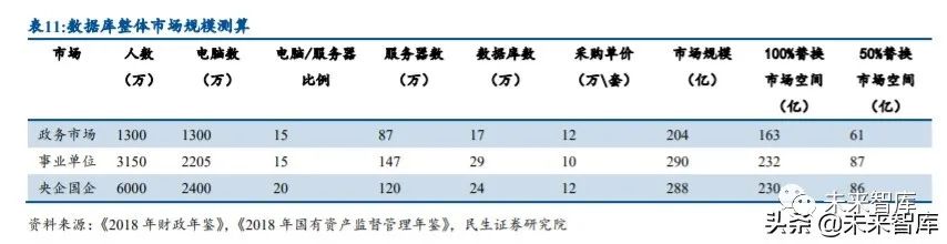 我们根据政府机关人数、事业单位人数和国有企业职工人数推算接下来 5 年内国产数据 库的市场情况。假设不考虑民用消费市场,根据《2018 年财政年鉴》、《2018 年国有资产监督 管理年鉴》显示,2017 年我国政府机关人数、事业单位人数、国有企业员工人数分别达到 1300 万、3150 万和 6000 万人,分别按照人均配置 1 台、0.7 台、0.4 台电脑计算,并按照 15 台、 15 台、20 台电脑配置 1 台服务器、5 台服务器配置 1 套数据库,一套数据库采购价分别为 12 万、10 万和 12 万,计算得出政务市场、事业单位和央企国企整体市场规模分别为 208 亿、294 亿、288 亿。考虑当前已有 20%的市场份额为国产数据库,因而若完全全部替代,则整体替换 市场空间为 163 亿、233 亿、230 亿,合计 626 亿;保守估计只完成 50%的替换,则新增空间 为 61 亿、87 亿、86 亿,合计 235 亿。