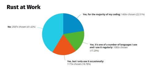 最新的2021调研中,Rust的采用在企业受众中呈现增加趋势,有高达59%使用Rust的受访者将Rust用于工作中,较去年大幅增加。另外,社群对Rust过去一整年的改进,包括在IDE体验和编译器调试上都给予了肯定,目前仍希望编译时间能继续改善。开发者使用Rust的比例持续上升,每周至少使用一次的受访者比例为81%,而且有75%的Rust用户已经可以编写生产就绪的代码,27%的人表示,编写Rust代码有困难,不过整体而言,99%的人使用Rust都算愉快,仅有1%的人觉得无趣。官方提到,Rust已经能够被归类在专业环境中使用的语言。在使用Rust的受访者中,59%的人偶尔会在工作中使用Rust,有23%的人在大部分代码中使用Rust。对大多数将Rust用于工作的使用者而言,似乎都要面临先甘后苦的过程,有83%的人认为,将Rust用于工作具有挑战性,官方提到,他们不太确定这个结果,但至少有82%的受访者,认为Rust可协助他们的团队实现目标。79%的受访者认为克服采用Rust的挑战很值得,且问卷另一题询问这些受访者,是否愿意在未来再次使用Rust,有90%的人表示同意。至于受访者在工作中采用Rust的原因,最大的理由是为了构建相对正确的软件,也有92%的受访者同意效率是他们采用Rust语言的主因,89%的受访者同意在工作选择Rust,是因为享受到了Rust带来的高安全性。Rust有许多部分仍在发展,有61%的受访者认为Rust编译时间仍需要改进,虽然Rust的编译时间一直是官方团队改善的重点,但显然社群仍觉得不足,其他社群认为需要继续改善的部分,包括磁盘空间、调试和GUI开发。Rust对IDE体验,包括持续采用rust-analyzer、IntelliJ Rust等工具都获得大比例受访者的肯定。调研团队回收的完整问卷数达到9,354份,总共来自113个国家,其中来自美国的受访者最多,占24%,其次是德国、中国和英国,除英文之外,简体中文、德语和法语也是Rust社群的偏好语言。(文章整理自IThome)