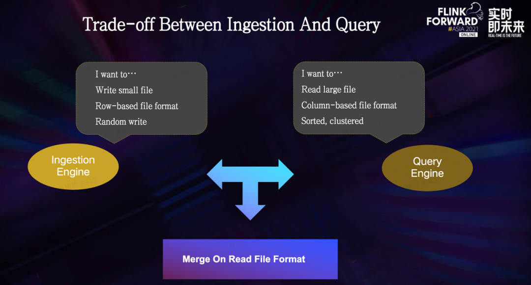 写入引擎更倾向于写小文件,以行存的数据格式写入,尽可能避免在写入过程中有过多的计算包袱,最好是来一条写一条。 查询引擎则更倾向于读大文件,以列存的文件格式储存数据,比如说 parquet 和 orc,数据以某种规则严格分布,比如根据某个常用字段进行排序,从而做到可以在查询的时候,跳过扫描无用的数据,来减少计算开销。