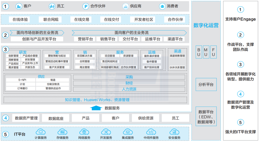 随后,华为基于愿景确定了数字化转型的蓝图和框架, 统一规划、分层次开展,最终实现客户交互方式的转变,实现内部运营效率和效益的提升。华为数字化转型蓝图包括 5 项举措。