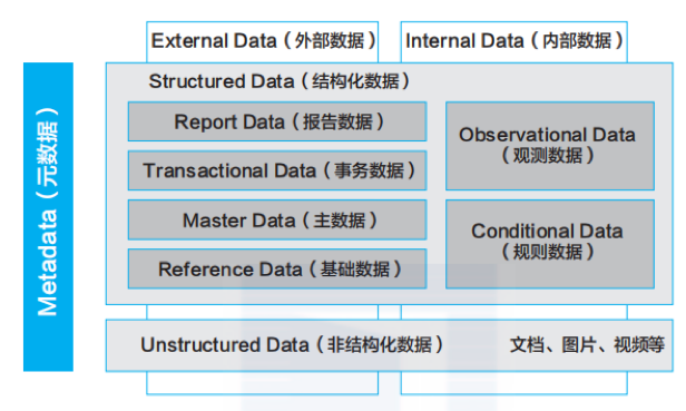 华为根据数据特性及治理方法的不同对数据进行了分类定义:内部数据和外部数据、结构化数据和非结构化数据、元数据。其中,结构化数据又进一步划分为基础数据、主数据、事务数据、报告数据、观测数据和规则数据。华为数据分类管理框架如图 4 所示。