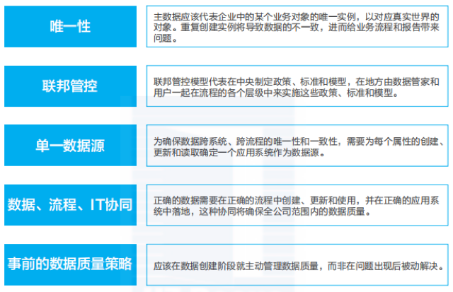 主数据是参与业务事件的主体或资源,是具有高业务价值的、跨流程和跨系统重复使用的数据。主数据与基础数据有一定的相似性,都是在业务事件发生之前预先定义;但又与基础数据不同,主数据的取值不受限于预先定义的数据范围,而且主数据的记录的增加和减少一般不会影响流程和 IT 系统的变化。但是, 主数据的错误可能导致成百上千的事务数据错误,因此主数据最重要的管理要求是确保同源多用和重点进行数据内容的校验。华为的主数据管理策略如图 7 所示。