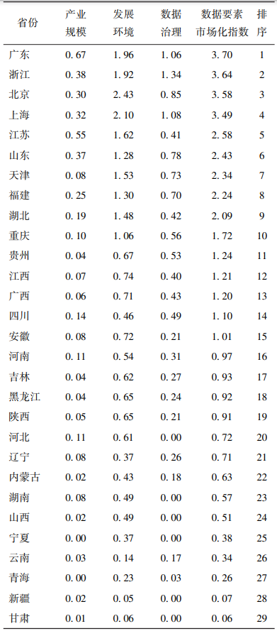 借鉴《中国分省份市场化指数报告(2018)》[20]的研究思路,数据要素市场化指数包含3个一级指标,分别是产业发展、发展环境、数据治理3个维度,8个二级指标,分别是数字产业化规模、产业数字化规模、市场化发展程度、新型基础设施发展程度、数据交易中心、数据要素市场发展规划、数据治理和监管基础、地方政府数据开放水平(见表1)。由于原始数据指数间量纲不同,为使其具有可比性,本文对数据进行极差标准化处理;同时,赋予每个指标相同的权重,以该分项数据要素市场化程度最高的省份为1,最低的省份为0,将加权后的数据要素市场化指数标准化为10。所有指标均为正向指标,利用各省份数字经济规模占GDP的比重作为调整系数,调整后数值越大反映该省份数据要素市场化程度越高。