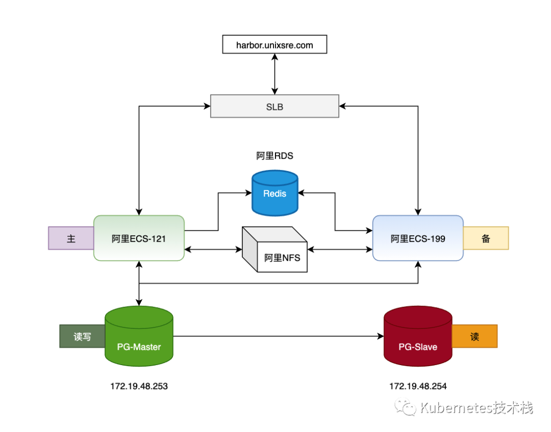 假设主库宕机或者主节点宕机,因为我们的Redis在阿里云,而Harbor的镜像数据在阿里云的NFS,要保证服务的可用性,这个时候,只需要快速的将从节点切换为主库,并且修改Harbor的配置文件,重启Harbor的服务下即可。