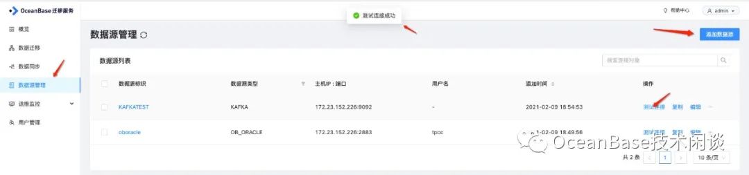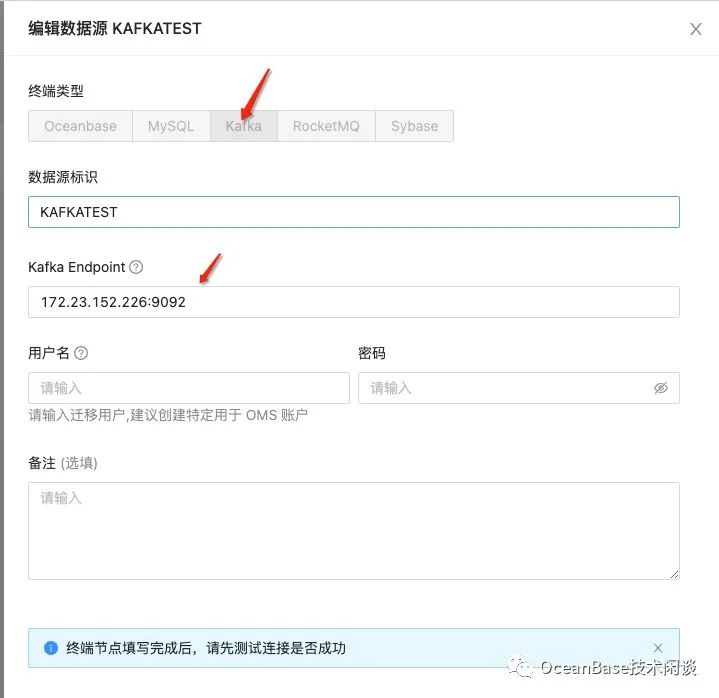 既然是将 OB 的增量同步到 Kafka,显然要为 OB 和 Kafka 分别配置一个数据源。
